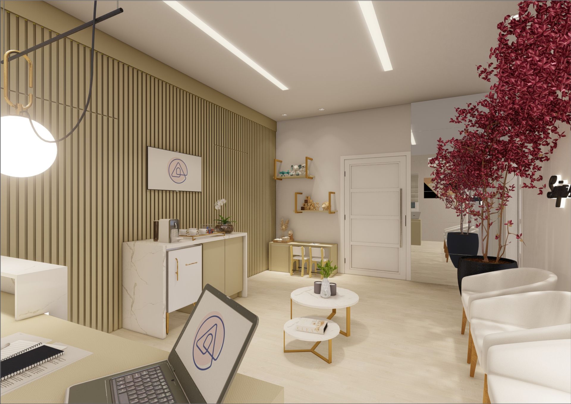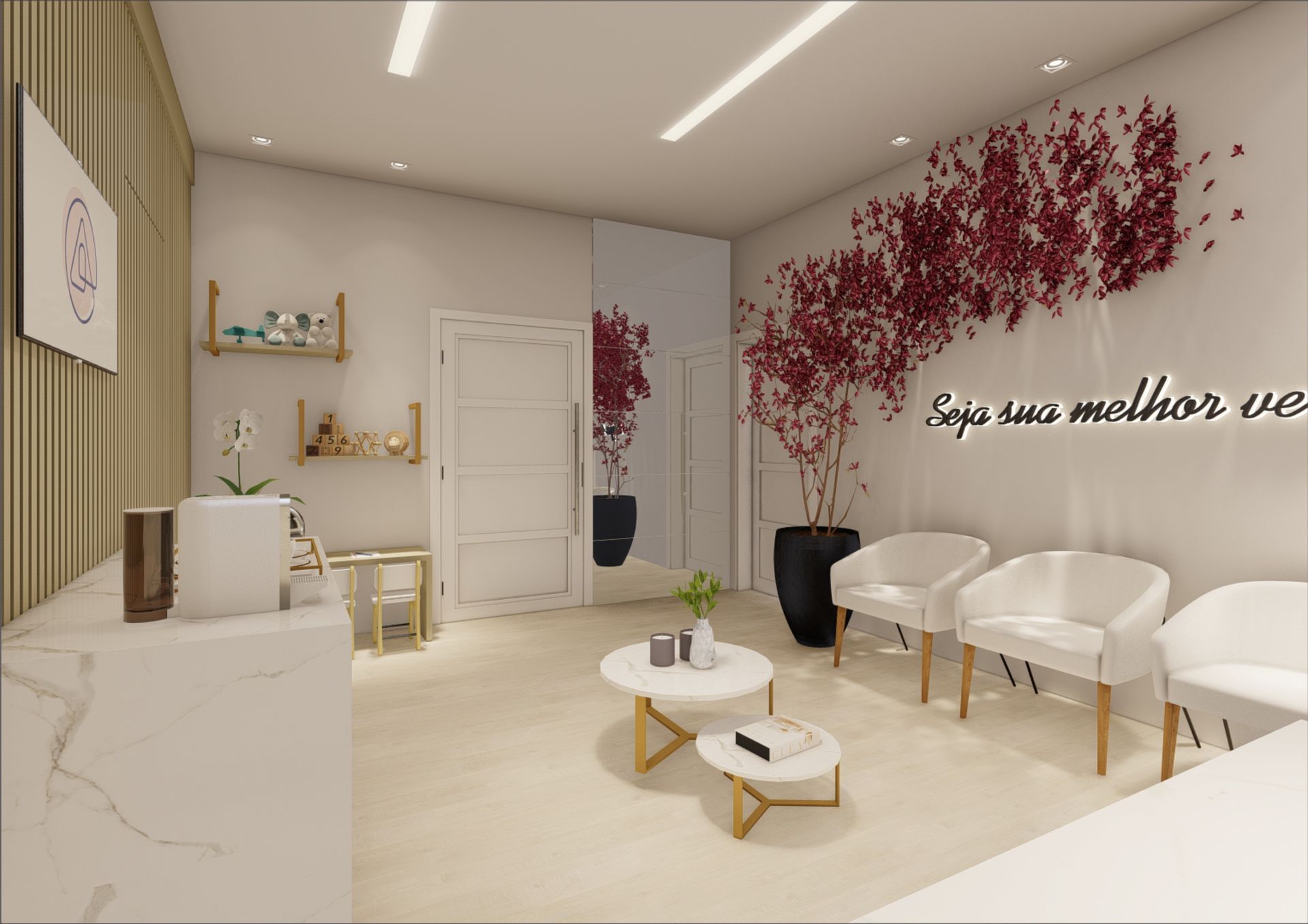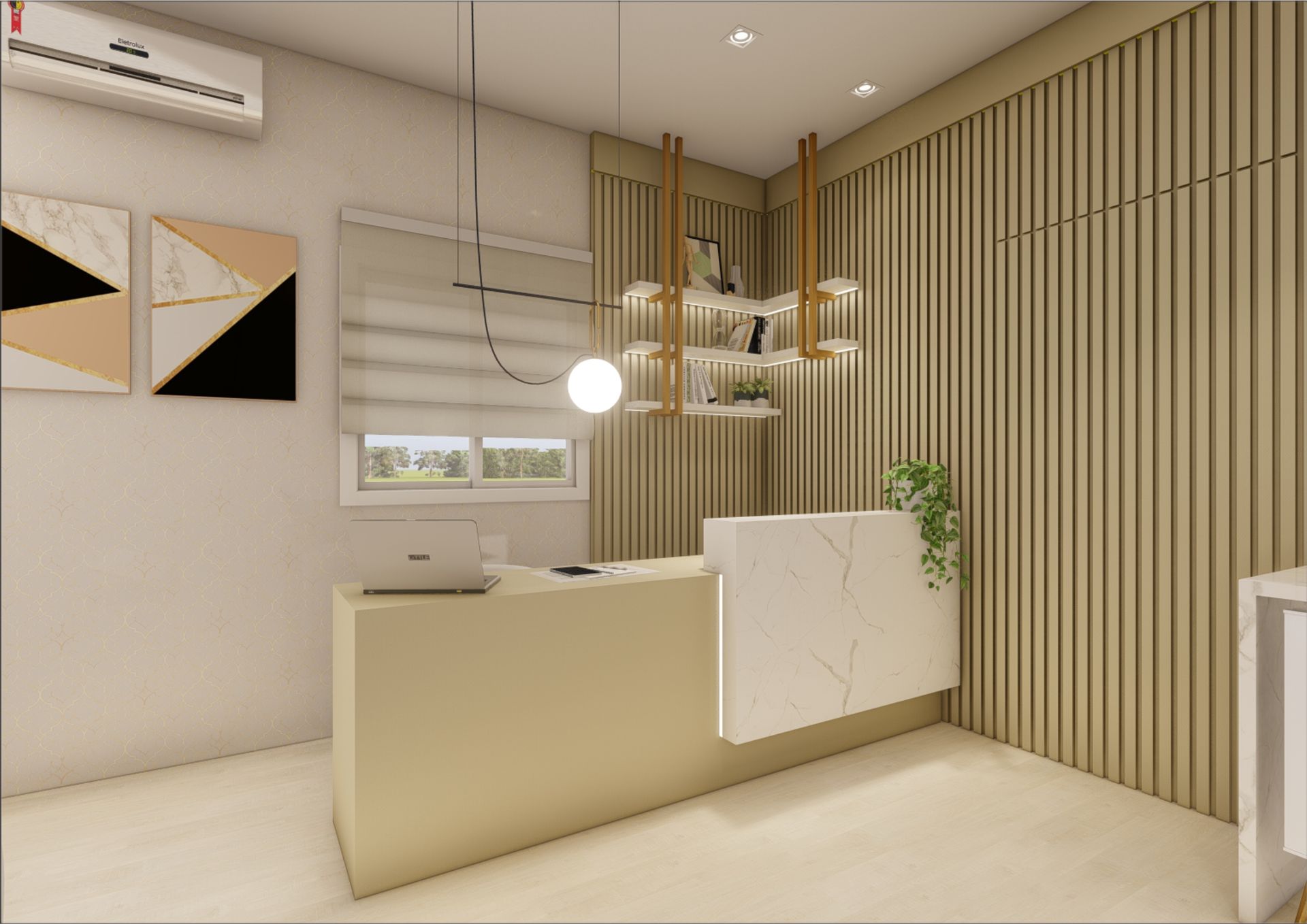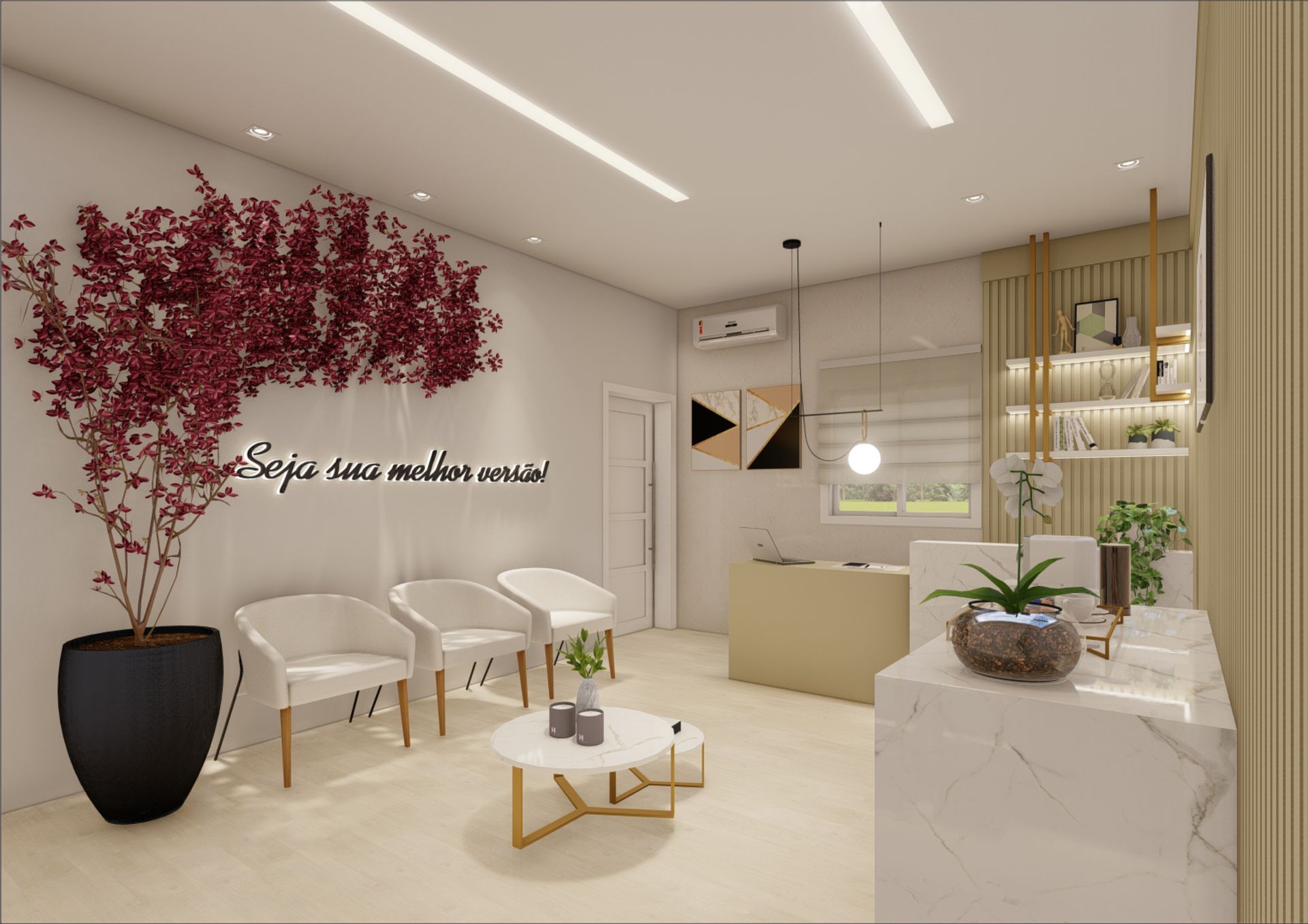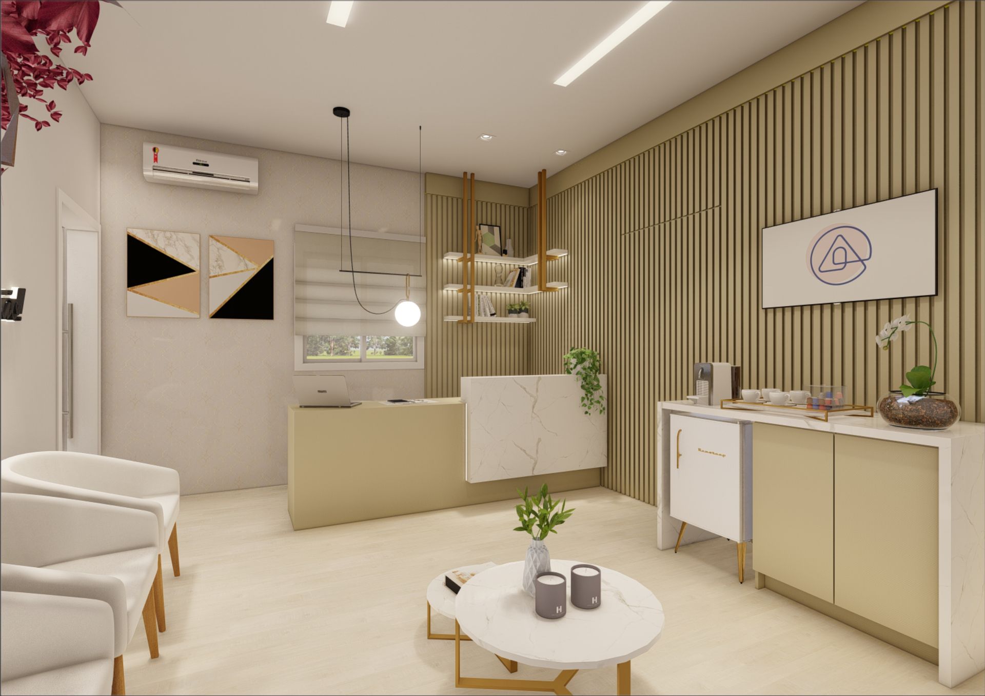 O espaço é projetado de forma a acomodar tanto a recepção quanto à espera. A recepção conta com um balcão elegante e funcional, onde os pacientes podem ser recebidos de maneira acolhedora e eficiente.