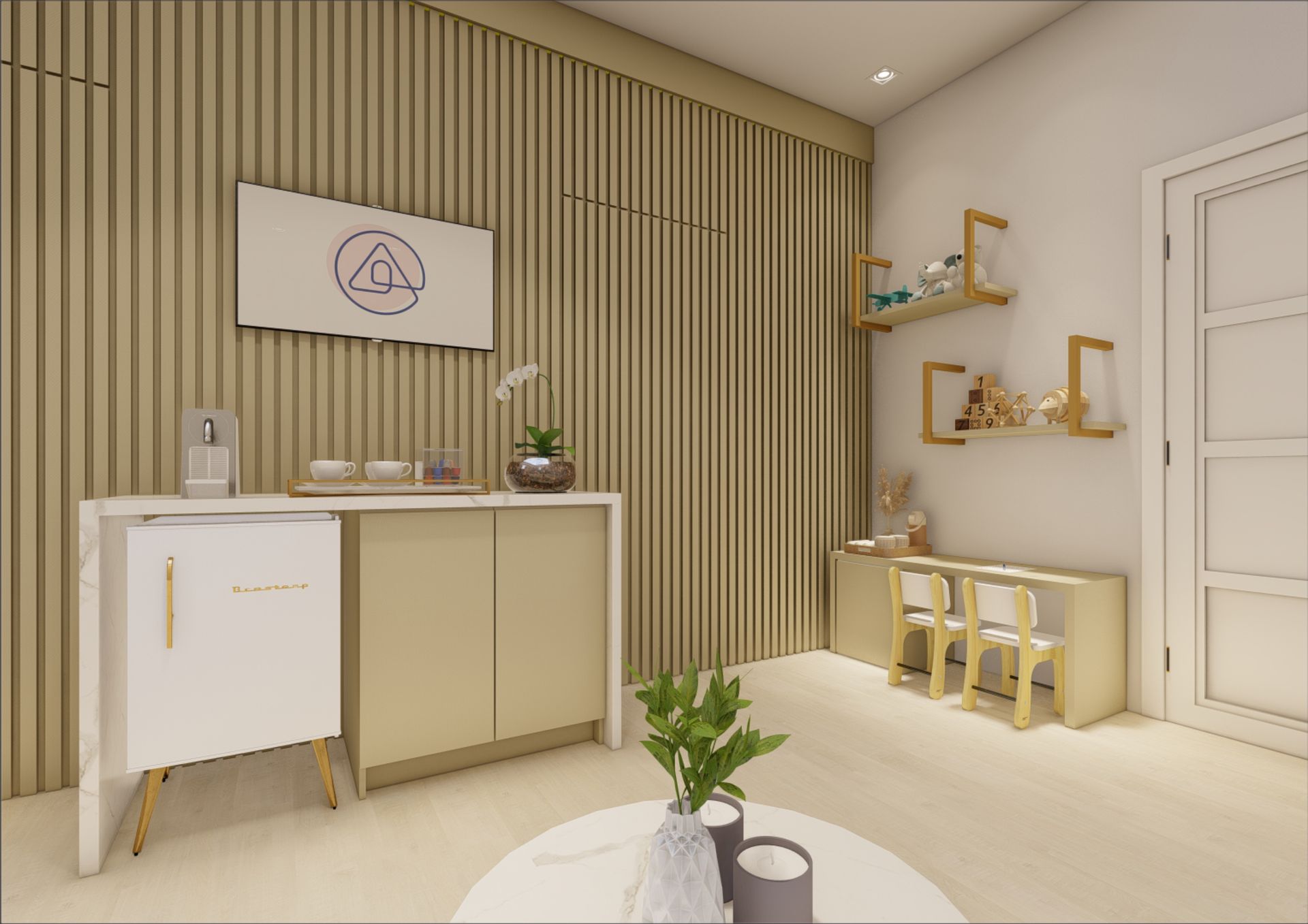Poltronas confortáveis são dispostas na área de espera, proporcionando um local agradável para os pacientes aguardarem seus atendimentos. Além disso, um espaço kids é criado para entreter as crianças, com brinquedos e elementos lúdicos que as mantêm entretidas e distraídas durante a espera.