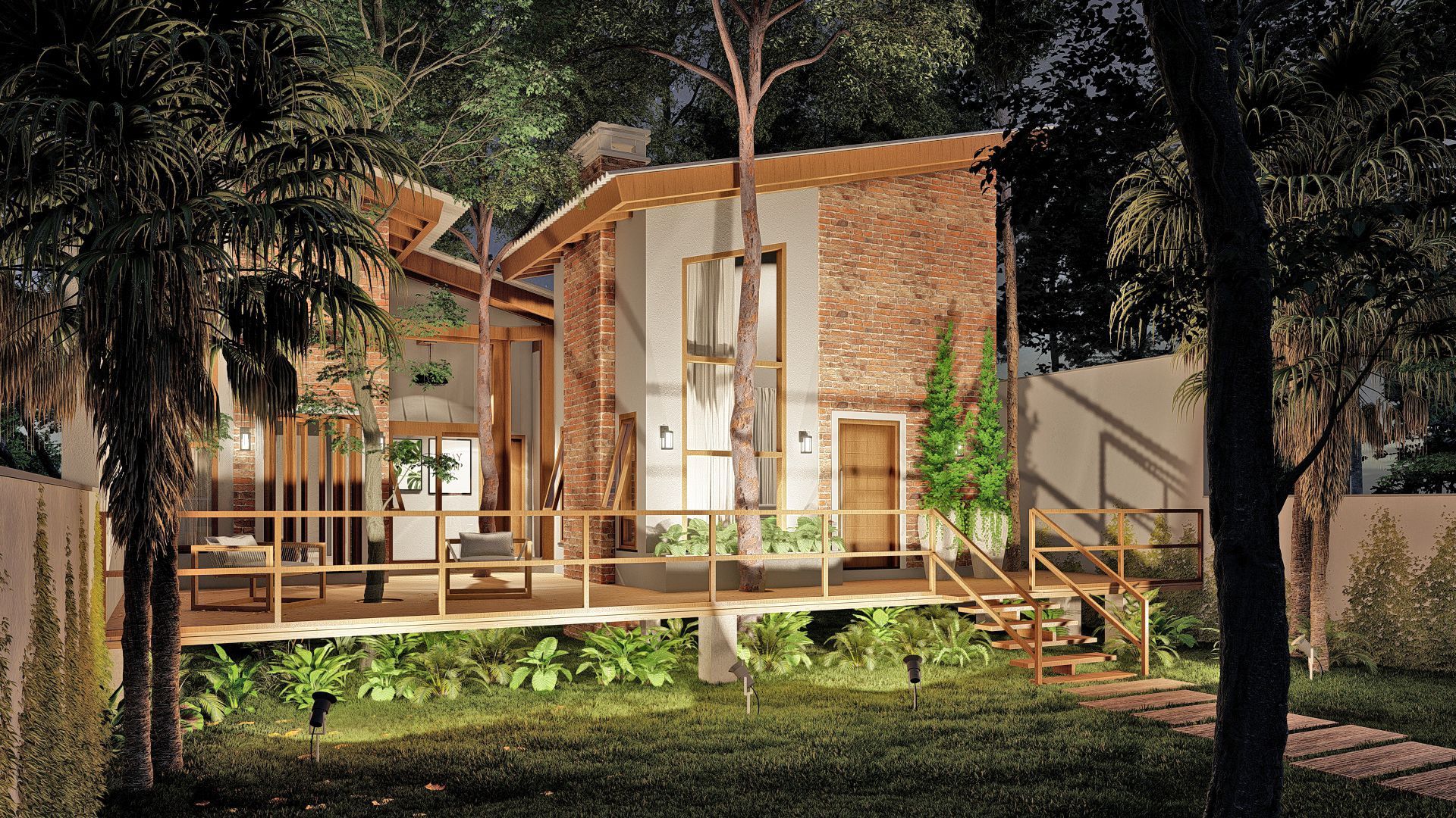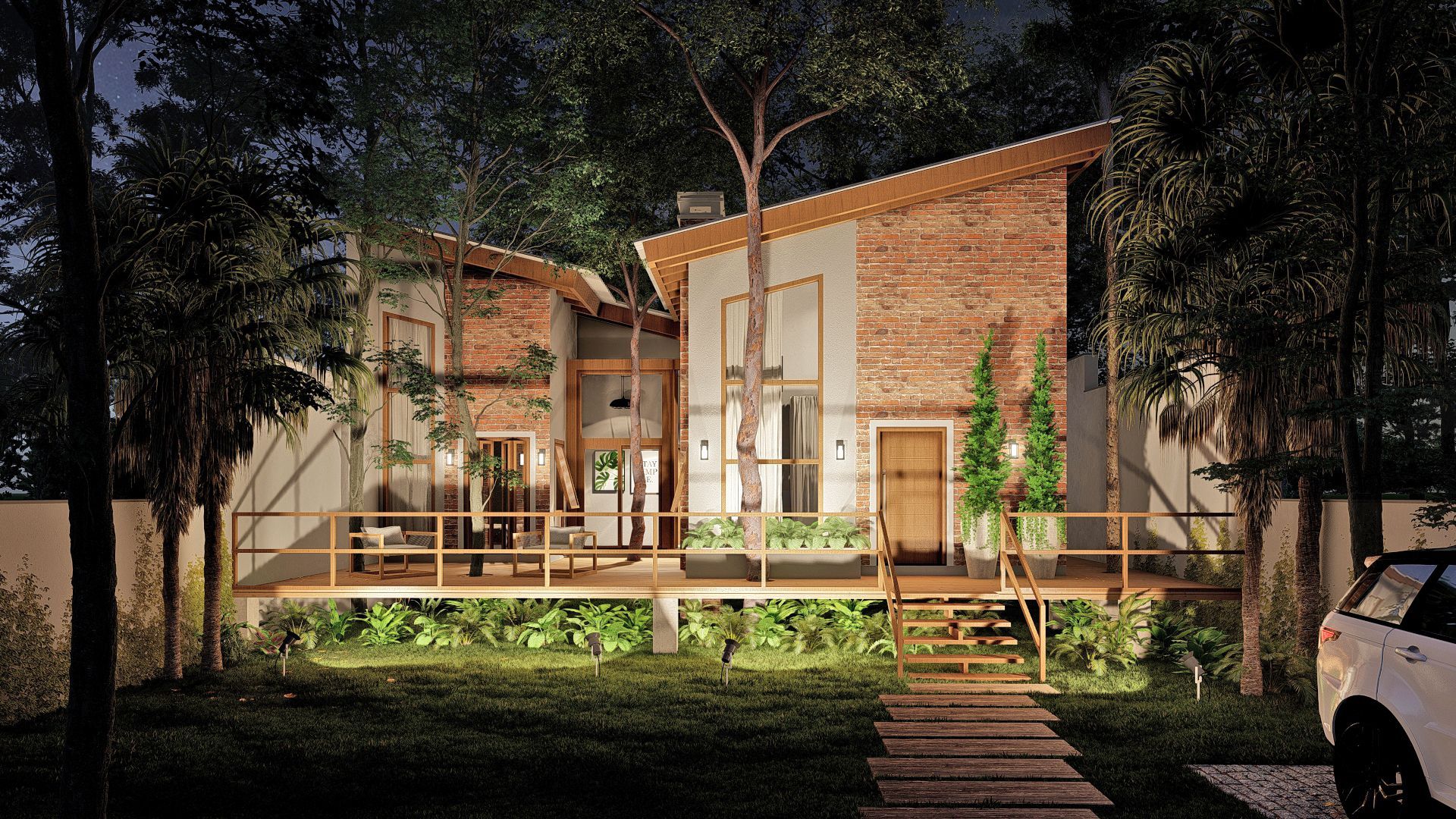 Com soluções inteligentes e ecológicas para manter a conexão do meio ambiente com a casa, a construção é afastada do chão, visando preservar ao máximo a fauna e a flora local.