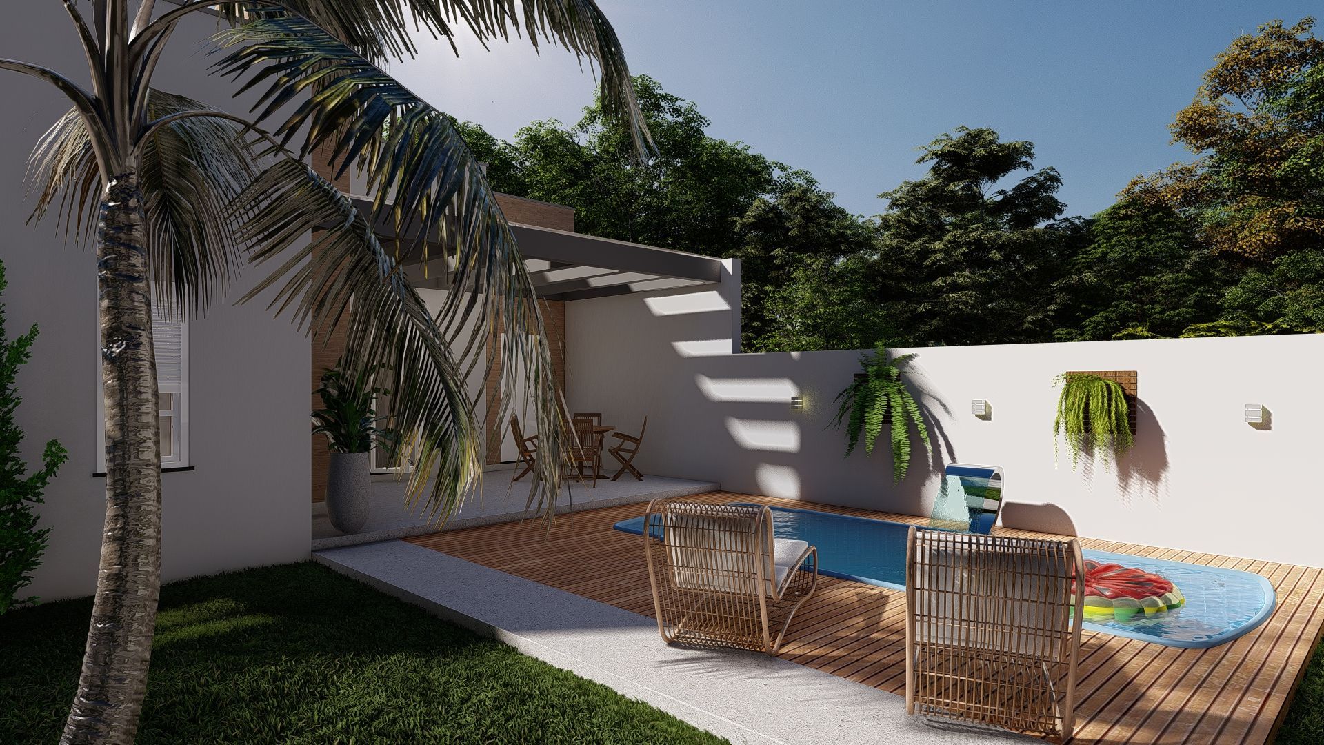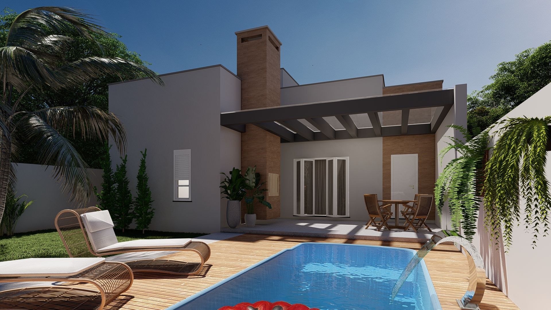 A suíte principal possui closet e mais dois dormitórios, garantindo conforto e privacidade para toda a família. No fundo da casa, há um pergolado com churrasqueira, que é perfeito para momentos de lazer e descontração com amigos e familiares. Ao lado do pergolado, há uma piscina que complementa a área de lazer.